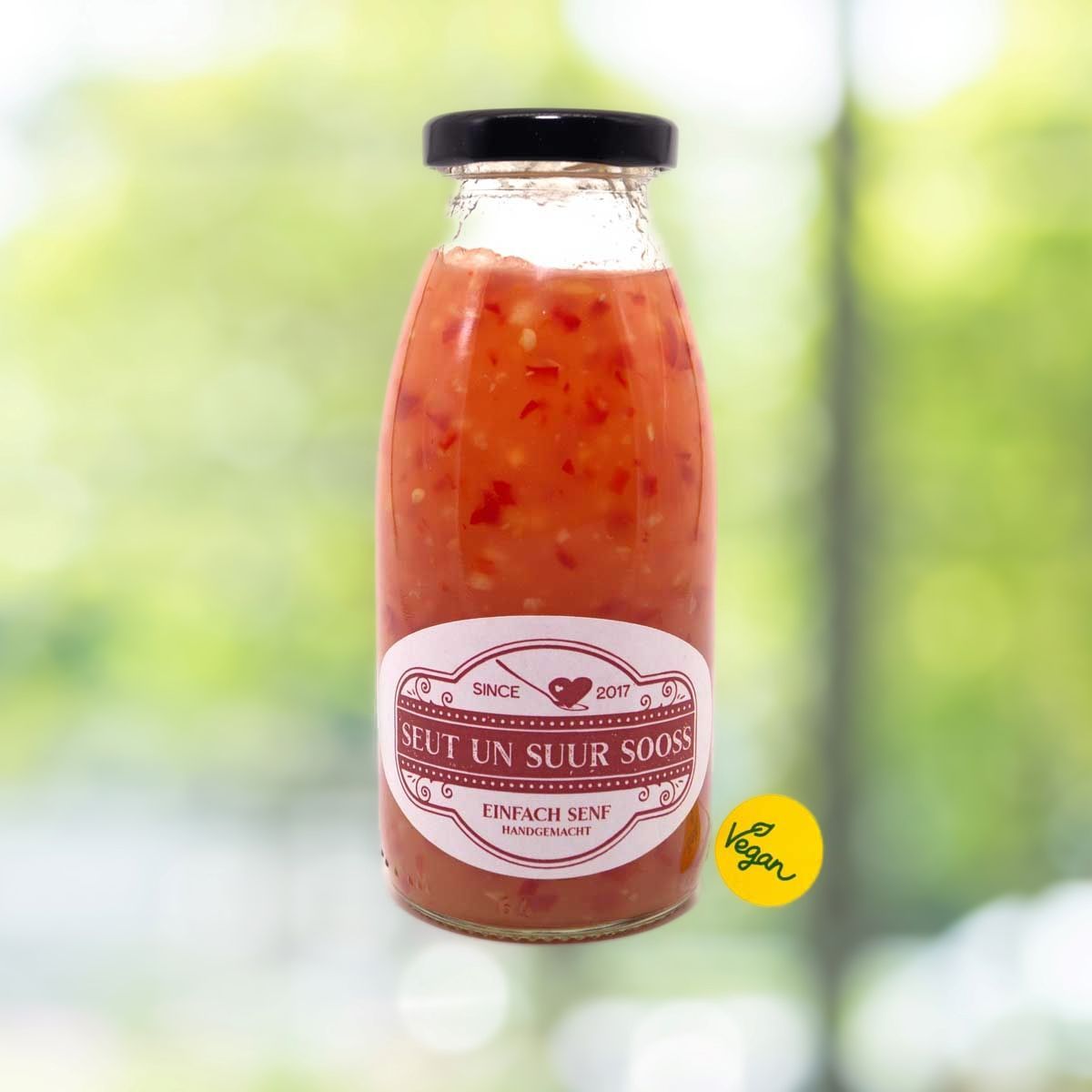 Eigentlich sollten wir auf diese Frage antworten: „Zu vielem.“ Aber das wäre zu einfach. Da es sich bei „Süß und Sauer“ um einen allgemeinen Begriff handelt, der viele Arten von Saucen und Kochmethoden erfasst, sollten wir das Produkt Einfach Senf Seut un Sour Sooss genauer anschauen. Die Einfach Senf Seut un Sour Sooss ist eine Süßsauer Sauce asiatischer Art. Dies bedeutet, dass der Einsatz in rein europäischen Gerichten seltener Anwendung findet. So eignet sich die Soße pur zum Aromatisieren von Reis oder als Dip für Vorspeisen, wie z.B. Frühlings- und Sommerrollen, zu Garnelen und Fischfilet, und weitere Produkte. In Hauptspeisen Kann die Einfach Senf Seut un Sour Sooss pur als Sauce, aber auch als Zutat in anderen Saucen verwendet werden. Natürlich können Sie sie Einfach Senf Seut un Sour Sooss nach Belieben weiter verfeinern. So sind z.B. Fruchtzugaben, wie Ananas, Banane, Orangen oder Mandarinen sehr lecker. Aber auch Bambussprossen und Mungobohnensprossen sind sehr schmackhaft und sind in der Kombination eine gute Beilage. Wir verzichten auf die Zugabe von Geschmacksverstärkern und weiteren lebensmittelchemischen Zusätzen bei unserer Einfach Senf Seut un Sour Sooss . Schauen Sie sich einfach die Zutatenliste an. Falls Sie es bis hierher beim Lesen geschafft haben noch ein kleiner Link zu einem leckeren und schnellen Rezept mit der Einfach Senf Seut un Sour Sooss als Zutat: