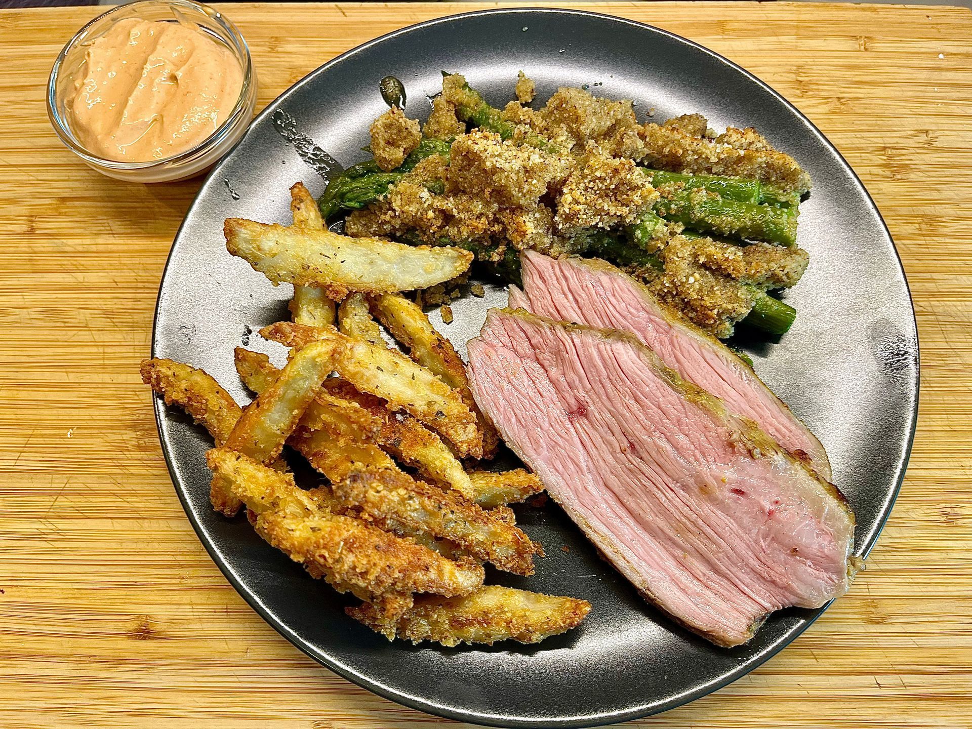 Orangen Senf mit Rosmarin, Thymian und etwas Knoblauch harmoniert sehr gut miteinander. Deshalb mariniere ich mit dieser Mischung den Kalbstafelspitz und vakuumiere ihn. Durch das Sous Vide garen erreiche ich genau den Gargrad den ich haben möchte. Zum Schluss geht es noch ganz kurz auf den Grill, um Röstaromen zu bekommen. Danach das Fleisch unbedingt 10 Minuten vor dem Aufschneiden ruhen lassen.